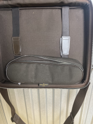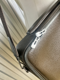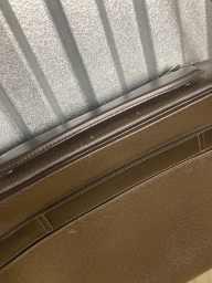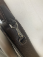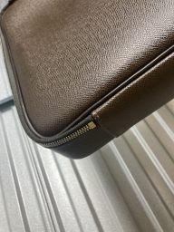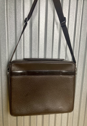 Porte documents Odessa en cuir Taïga marron, fermeture à glissière à double curseur, poignée, anse sangle régalble, poche plaquée au dos, doublure en toile marron à cinq poches, deux sangles élastiques, une trousse zippée amovible.